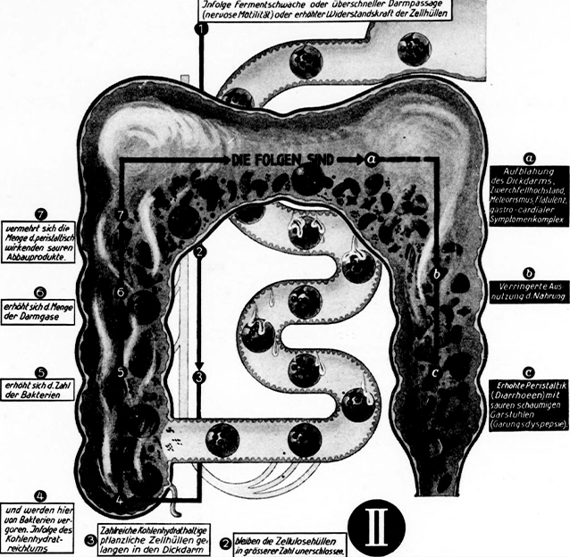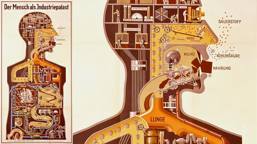 In 1926, Kahn published his most famous work, a poster titled Man as Industrial Palace. The illustration depicts the human body as a vast factory operated by tiny workers. The lungs function like mechanical bellows, the stomach becomes a rock-sorting plant, the throat operates as a system of gears, and the brain appears as a switchboard filled with control panels.